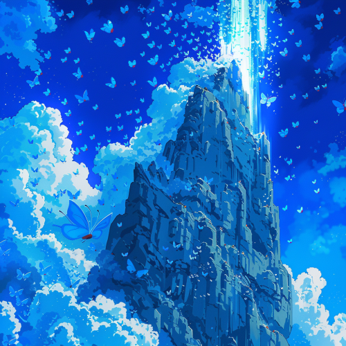 A thousand blue moths flying up a tall mountain face. Geysers are exploding out from the mountain’s face creating a layer of clouds. Bright blue night sky. Hayao Miyazaki anime art style. --v 6.0