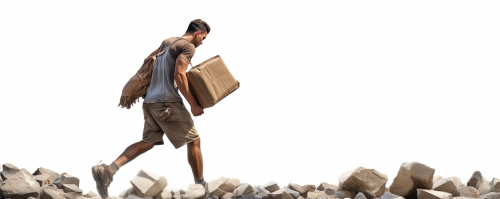 singe wide angle view of man walking away from heavy objects, boxes, rocks. His back is to the objects. He is not carrying anything. isolated on white, no shadows, photorealistic, --ar 10:4