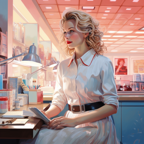 a norman rockwell style image of a blonde pharmacist in her 40s in a stylish office with whites and blues and red and pink highlights