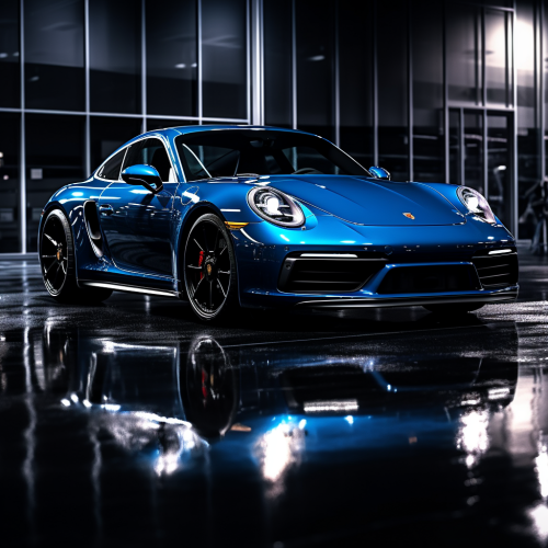 A dazzling cobalt blue Porsche Taycan Turbo S, parked in the middle of an open-air rooftop garden atop a modern skyscraper in Tokyo at night. The electric Porsche’s sleek, futuristic design glows under the ambient neon lights of the city, with the Tokyo skyline visible in the background, filled with towering buildings and digital billboards. The lush greenery of the rooftop garden contrasts with the polished, high-tech feel of the Taycan, its aerodynamic lines reflecting the vibrant colors of the city lights. Cherry blossom trees gently sway in the wind nearby, their pink petals occasionally drifting onto the car’s hood. The hyper-realistic shot, taken with a Nikon