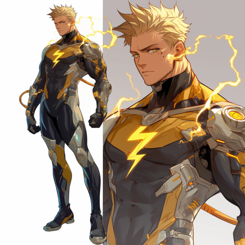 a design for a speedster, male, blonde hair, original costume design, primary color is silver, secondary color is black, multiple angles, character posing, character art, graphic novel design, --ar 1:1 --niji 6