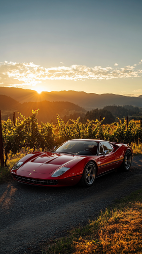 A stunning red Ferrari Daytona SP3 parked next to a sprawling vineyard, the sun setting behind the mountains, casting a warm glow over the scene. --ar 9:16