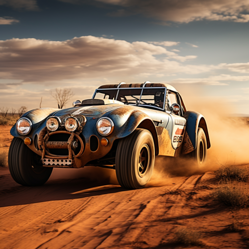 a cyberpunk offroad Shelby AC cobra racing in the outback