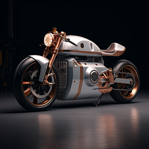an electric caferacer motorbike with a look of a Shelby AC Cobra in raw aluminium with leather and copper accent