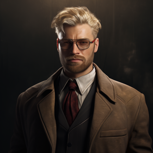 photorealistic male, light blue eyes, glasses, blonde hair with medium blonde beard, black coat, red vest, red tie, 1900s era Shelby gang