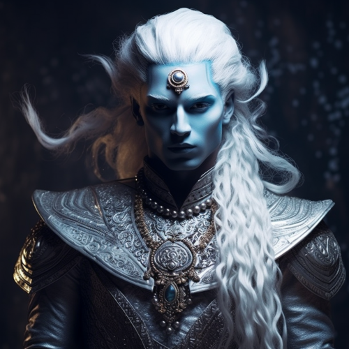 beautiful female blue-skinned firbolg druid, armor made of crabs, starry light about her, sea in the background, fantasy character art