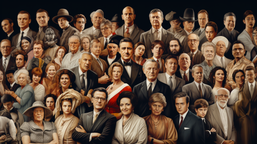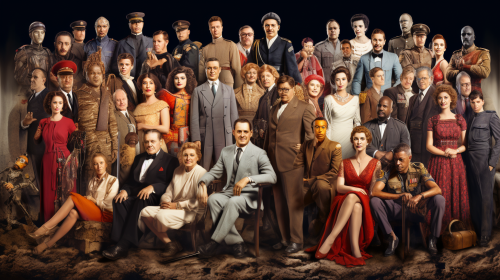 view of lots of famous people posing side-by-side including WW2 historical people, historical Roman people. highly detailed --ar 16:9