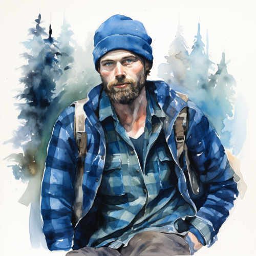 a totally blue lumberjack with pale blue skin, watercolor in the style of Helen Oxenbury