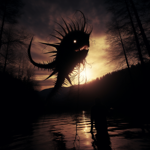 evil man in the sky, smiling in the shadow, woman silhouette on the island, night, weird fiction cover art