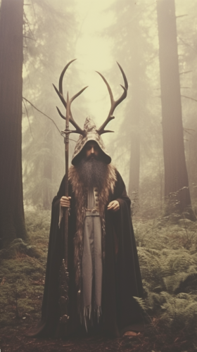 1980's Polaroid photo of a crzay cult leader wearing a cloak and antlers in the forest, --ar 9:16