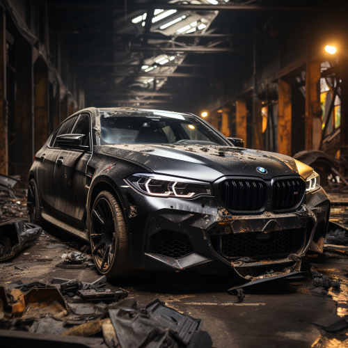 a dslr wallpaper photo of a slammed black 2020 BMW M8 in a desolate industrial zone in the dark --ar 16:9 --v 6.0