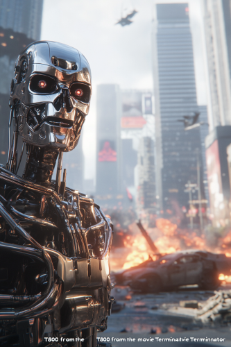 subject: "T800 from the movie Terminator" list of creative detailed descriptions about "T800 from the movie Terminator": menacing, metallic, futuristic, relentless list of detailed descriptions about the environment of the scene: urban cityscape, destroyed buildings, flames list of detailed descriptions about the mood/feelings and atmosphere of the scene: chaotic, high-stakes, explosive list of specific artistic medium as well as techniques: digital art, high resolution 3D rendering, dynamic camera angles list of multiple artists, illustrators, painters, art movements: Simon Stålenhag, James Gurney, Futurism --c 10 --ar 2:3