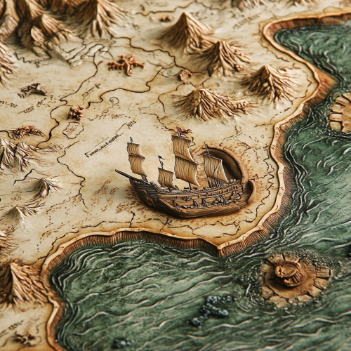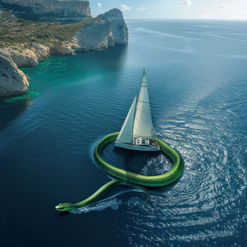 a sailing boat in a shape of green snake in cape formentor mallorca, sunny day, realistic, calm ocean