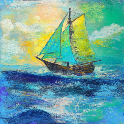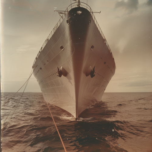 Painting of a massive futuristic boat in the ocean, red and white, 1970's surrealist dark fantasy art style, book cover art, realist: lifelike accuracy, volumetric lighting, --no rocks --style raw --ar 1:1