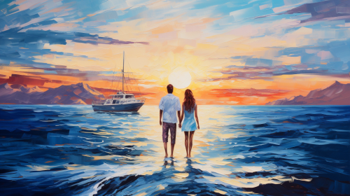 a beautiful oilpainting with vibrant colours of a couple standing in front of the azure ocean of genova,wearing a white dress and a blue business shirt, sunset,ship, impasto,scumbling, --ar 16:9