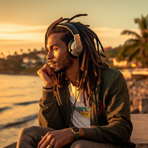 uma homem jovem usando camiseta do Bob Marley, sentado a beira mar ouvindo reggae em seu fones de ouvido, 8K