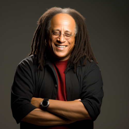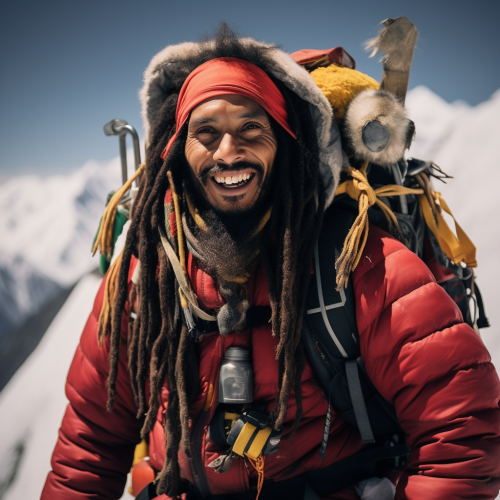 happy bob marley climbing the mount everest in high altitude with dreadlocks and all the climbing equipments and clothes