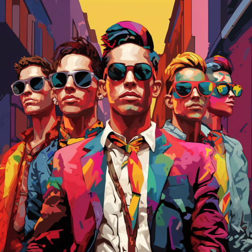 Four young guys with bizarre looks, they wear sunglasses, they take refuge in a street doorway, carrying small umbrellas on their heads, comic caricature, illustration in bright and loud colors, 16 bits pc style, The bacchanal, street celebration, expressionism,devilish gestures --style raw --v 5.2