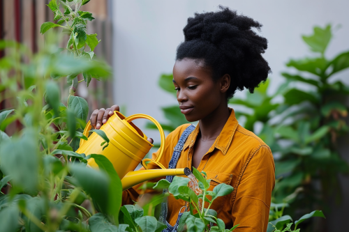 a black woman in her 20s watering her plant small plant garden --v 6.0 --ar 1920:1280