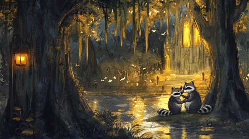 a scene for a wedding including two raccoons. include a close-up of raccoons getting married. provide a cute storyboard concept art for a location sketch for a wedding scene in a cypress swamp mixed into a cathedral. the swamp includes cypress trees and cypress knees. include birds. Nighttime include warm lantern lighting. raccoons. include loose watercolor and linework --ar 16:9
