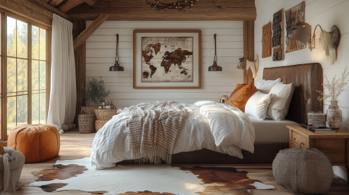 Envision a bedroom that combines the rustic charm of a homestead with chic bohemian accents. Wooden beams and a patchwork cowhide rug lay the foundation for a layered bedding setup featuring lace and linen. Eclectic wall art and a mix of vintage and modern lighting complete the look. Capture this homestead chic bedroom in a full-view photo, emphasizing its stylish yet homey appeal. Camera: DSLR - Canon EOS 5D Mark IV. Lens: Canon EF 24-70mm f/2.8L II USM. Composition: Wide shot, room-centered, horizontal orientation, balance between furniture and space. Film: Digital, high resolution, color profile sRGB. Camera settings: ISO 400, f/2.8, 1/60 sec. --ar 16:9 --v 6.1 --s 250