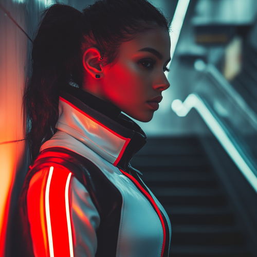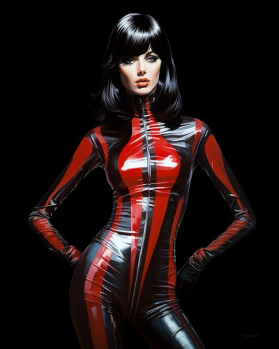 Fashion Model, Adult Female, Black Hair, Jean Shrimpton Looks, reflective Chrome bodysuit, Hajime Sorayama Art Style, Waist Up, Full Torso, black and red rim light, black background --ar 4:5