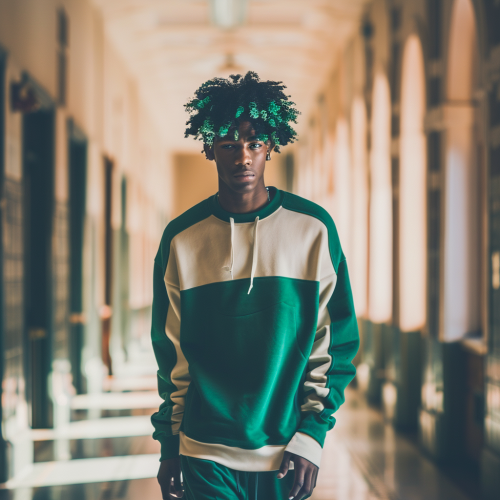 light medium toned african american man with curly hair in twists with green ends. wearing a color block sweatsuit walking in a dorm hallway in the style of bold fashion photography, dark emerald and light brown, street-inspired, barbiecore