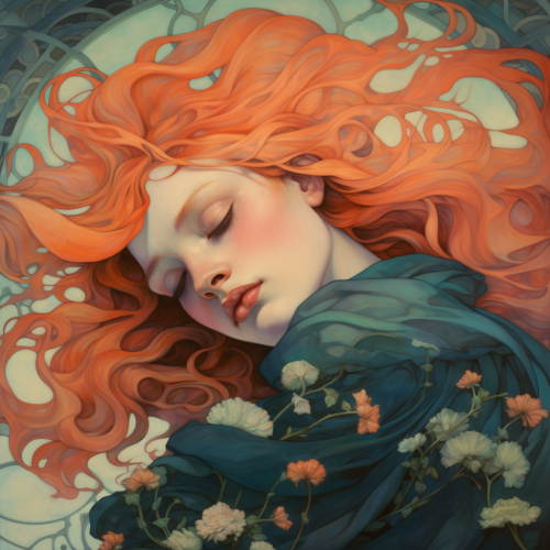 jewel tone colours bold art nouveau poster of a girl with red hair