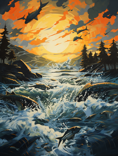 Style of Bold brush stroke acrylic painting ,lots of dead fishes floating on the river, electric pulse on the river, spring season --ar 3:4