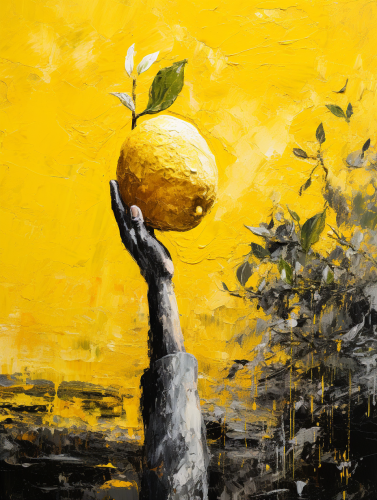 a big coveted lemon in a hand, Bold brush stroke acrylic painting style , acrylic touch, spring season --ar 3:4