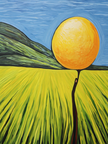 a big coveted lemon in a hand, grass hill background, Bold brush stroke acrylic painting style , acrylic touch, spring season --ar 3:4 --no real image