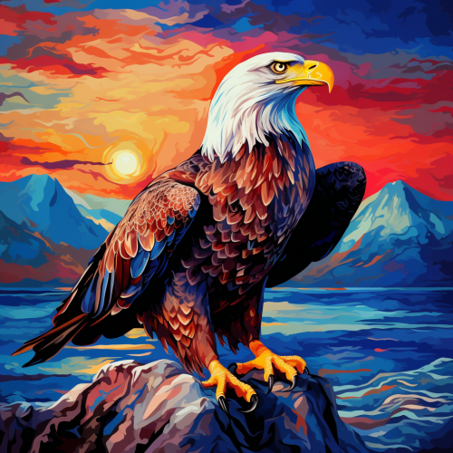 an eagle near the ocean after sunset, in the style of blue and white, bold primary colors, warmcore, hikecore, reductionist form, uhd image, bold, colorful, large-scale