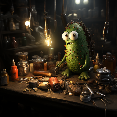 a freight railcar where the front leading locomotive railcar is a pickle. Pressing ahead with energy, power, boldness, and confidence. The colors are bright red, slate blue, and steel grey. In an animation Pixar style. Moving left to right and toward the viewer.