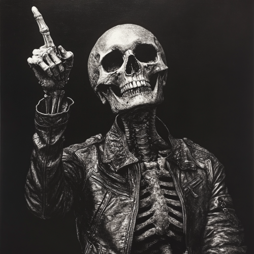 A skeleton in a leather motorcycle jacket, raising his centre finger in an act of defiance, open resistance, bold disobedience, his hand must be facing backward .