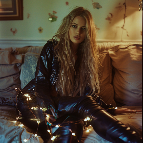 A beautiful long haired blonde woman is seated on a sofa staring at the camera in a grimy English flat , she is wearing a black leather jacket and skintight black leather leggings , she has fairy lights draped across her leg and shoulder, the photograph has a saturated high fashion grimy sheen similar to the contax T2 photographs in colour film by Juergen Teller