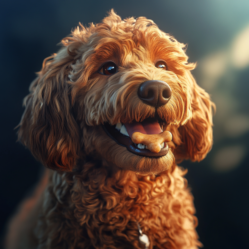 Magical golden doodle, hyper realistic, happiest dog ever, realistic, beautiful hair, medium sized golden doodle, with a bone, stylized, cinematic, color grading, futuristic, 8k, open shot, futuristic, realistic, make it more futuristic, 100 years in the future, incredible beautiful dog --style raw