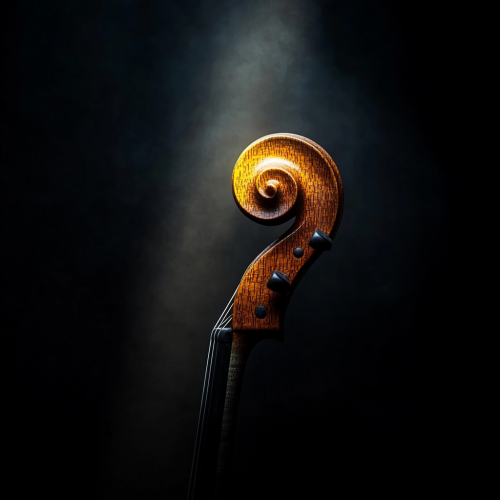 Create a minimalist, high-contrast photograph of a single violin scroll emerging from complete darkness. God's light shining down the violin srcoll. The scroll should be elegantly illuminated with soft, dramatic lighting, showcasing its intricate woodwork and fine details, while the rest of the violin fades into the black background. The mood should evoke mystery and elegance, with the play of light and shadow creating a timeless and refined atmosphere. warm dark golden tone.