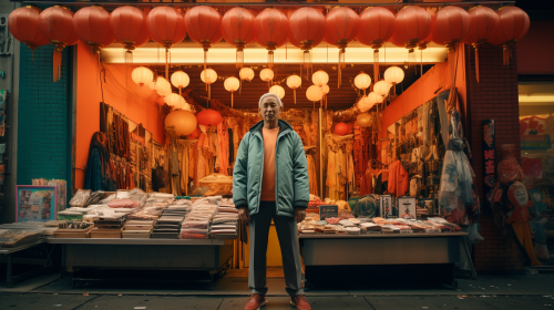 photography of happy store owner infront of his store in a big city, futuristic --aspect 16:9