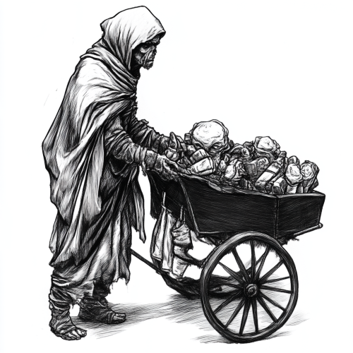 Books tumbling down hill, cart overflowing with green.