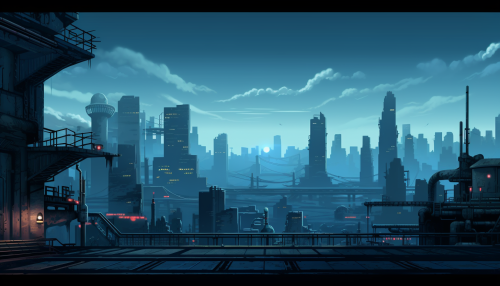 Illustration of a futuristic hipster in his 40s, wearing sunglasses, with a big beard, playing a black acoustic guitar in a relaxed and active stance. Next to him is a cyberpunk resembling the main hero from the movie 'The Crow' playing a silver trumpet, . They are perched on the edge of a skyscraper, overlooking a gloomy dystopian city. Streets below are alive with neon lights and activity."