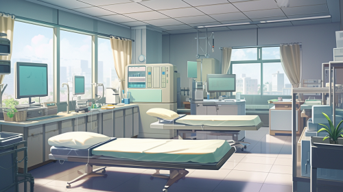 Hospital examination room, doctor, nurse, patient, Hayao Miyazaki style, 2D --ar 16:9 --niji 5