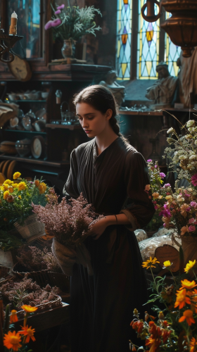Agatha Christie style front cover of a movie with a bored florist girl in a flower store in rouen, and a monk uncover a medival secret about black flowers --ar 9:16 --v 6.0