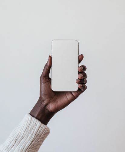 light skin hand holding an iPhone with a white screen in one hand, in a mockup style. The background is white studio, and the focus of attention is on the smartphone. There are no text or other elements present. This shot will be used for advertising purposes, so it needs to look professional and suitable for use as a social media post or advertisement. It should convey confidence and modernity while highlighting the sleek design of both the device and the fingers of its user. --ar 107:128