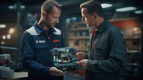 A woman is holding a modern vacuum cleaner resembling a Bosch model. She is dressed in casual attire, consisting of jeans and a simple white T-shirt. The vacuum cleaner features a sleek design, primarily silver in color with black accents. The scene is set in a bright, minimalist living room with white walls and a wooden floor. In the background, there is a large glass wall offering a view of a green garden. Nikon lens f/2.8, 45.7MP, ISO 25600, 1 / Shutter 8000 --ar 9:16 --v 6.0