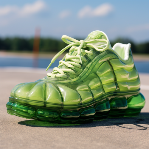 a mid shot, high angle shot of a DJ booth and a DJ performing to a bunch of guests at a green slip and slide catwalk runway for a massive launch event in a majoy global city, models are sliding down the runway in inflatable style clothing and streetwear merchandise, there are paparazzi and spectators watching the fashion show and also grooving to music enjoying themselves, it is a hot summer's day, ultra realistic, cinematic --ar 16:9 --style raw