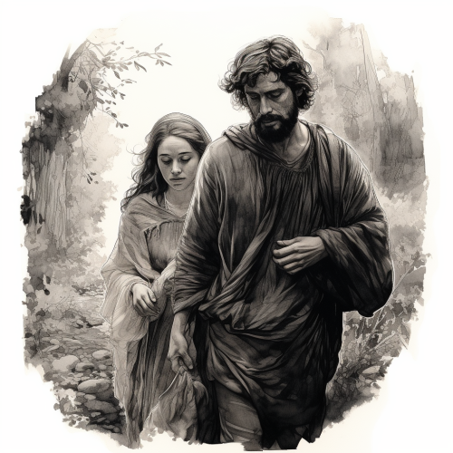 ink drawing. un uomo con seno da donna, una tunica del 1500, tiene sulle spalle un neonato, passeggia nel bosco