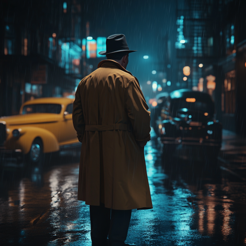 A hyper realistic photograph of a creepy anthropomorphic Scooby Doo 1940s beefed up mafia boss in a trenchcoat at midnight, standing menacingly and watching us from across the rainy street, hyper realistic and hyper detailed, hyper emotional, dark lighting, 32k UHD resolution, shot on Hasselblad H6D 400c Multi shot, Mitakon Speedmaster 35mm f 1. 2 XCD