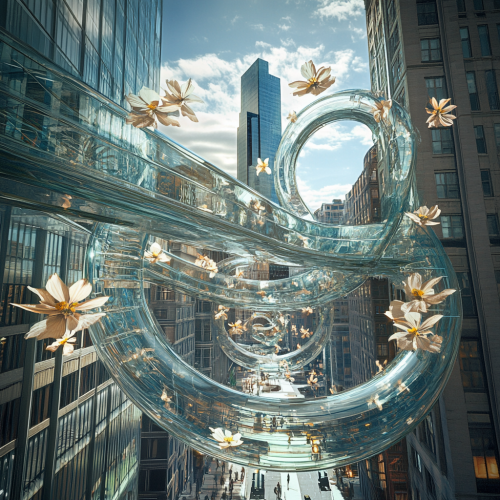 How does Boston look in the distant future, fascinating, 7000s, creative, realistic, photographic of Boston city, incredible,city square 3D rendering, glass skyscraper, different perspective,3d rendering glass roads, rollcoaster, 3d rendering glass and winding roads, trees and houses hanging in the air, robots, half sun half moon, sunset