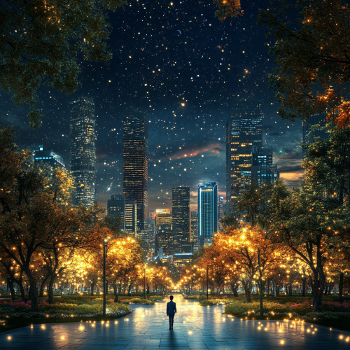 What Beijing looks like, fascinating, 2024s, imaginative, realistic, photographic of the city of Beijing, background Beijing city view, incredible, creative, city square 3d render, trees, night, stars, beautiful woman and handsome man, moon shine, city lights