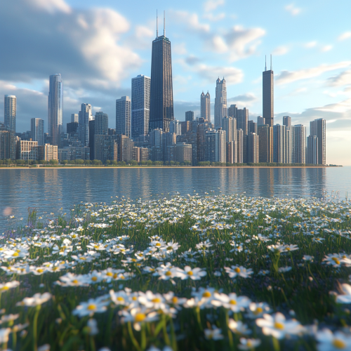 What Chicago looks like, fascinating, 2024s, imaginative, realistic, photographic of the city of Chicago, background Chicago city view, incredible, creative, sea 3d render, spring, flowers , people